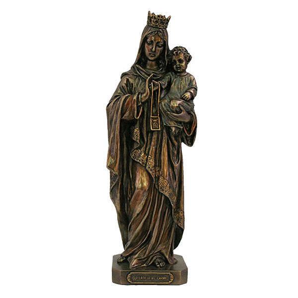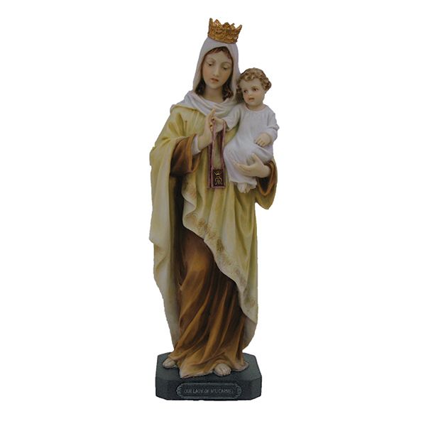 This beautiful Catholic statue features the Blessed Virgin Mary as Our Lady of Mt. Carmel, holding the child Jesus and the brown scapular. Devotion to her is ancient, as is the wearing of the scapular for spiritual protection and aid in salvation.