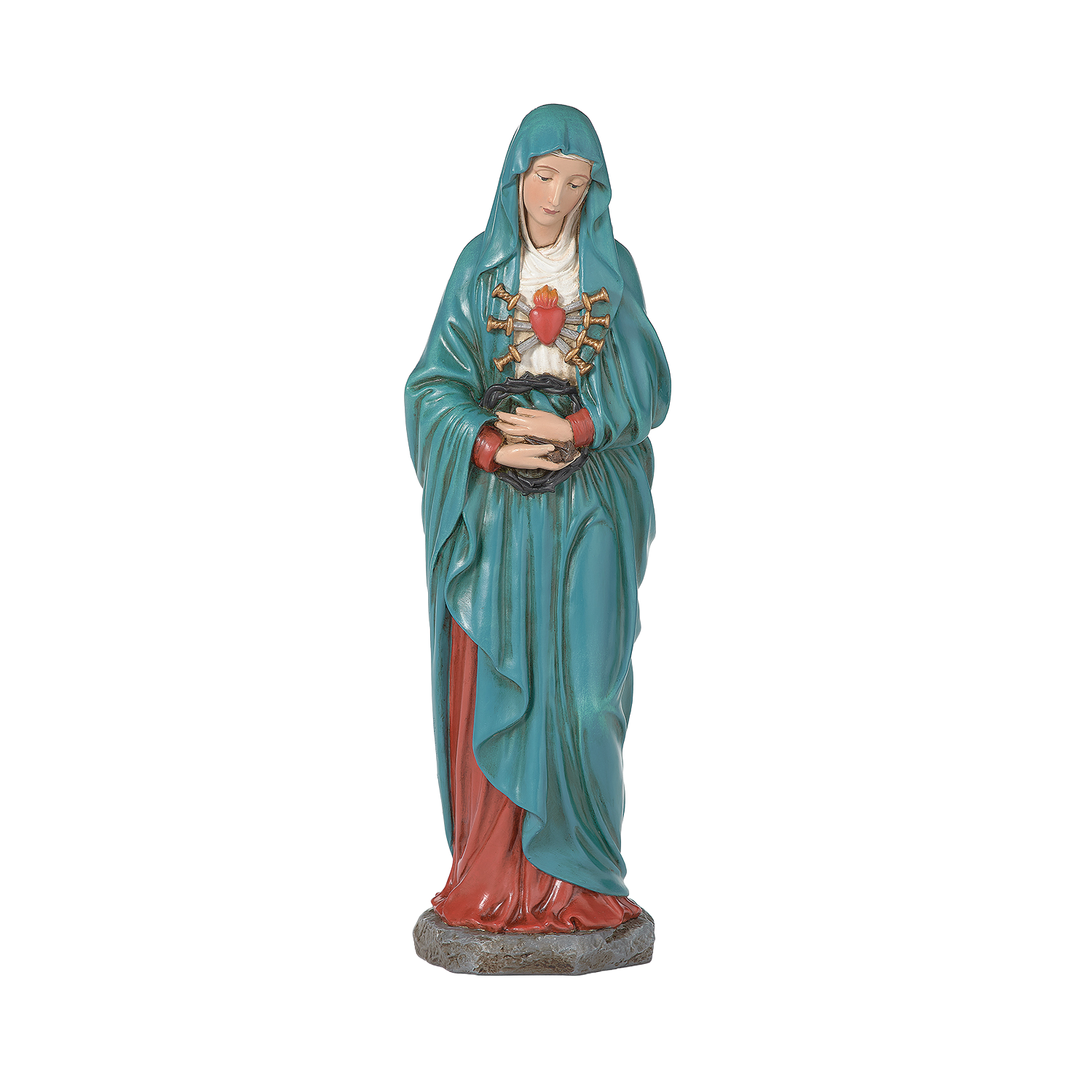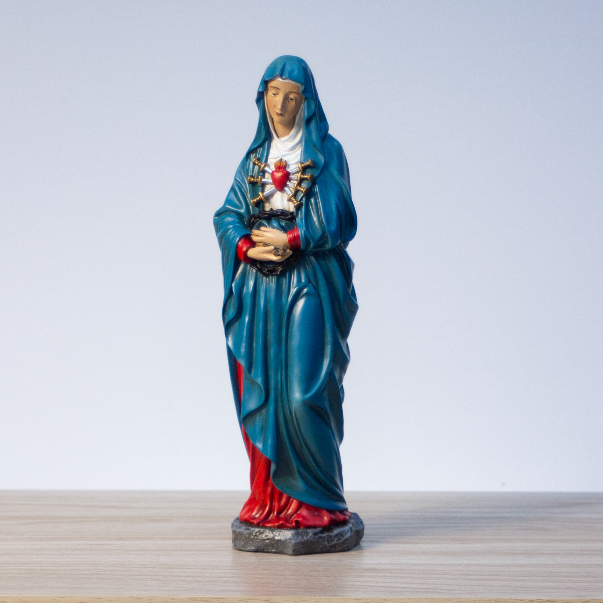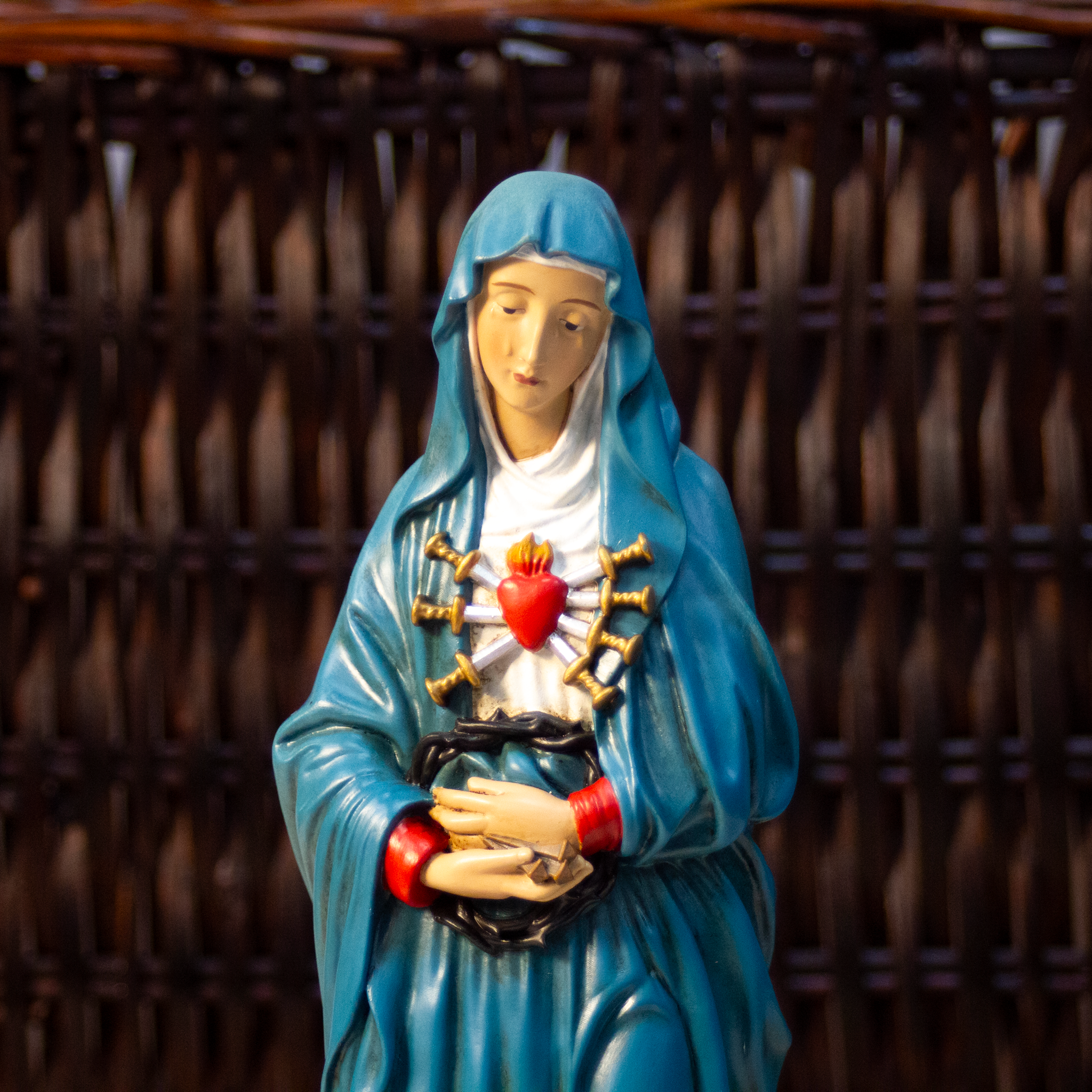 Classic image of the holy Virgin Mary with her Immaculate Heart pierced by swords. Each one symbolic of the Seven Sorrows Our Lady endured during her and Jesus' life together on Earth. She is here holding Christ's crown of thorns and the nails that pierced His sacred Body.