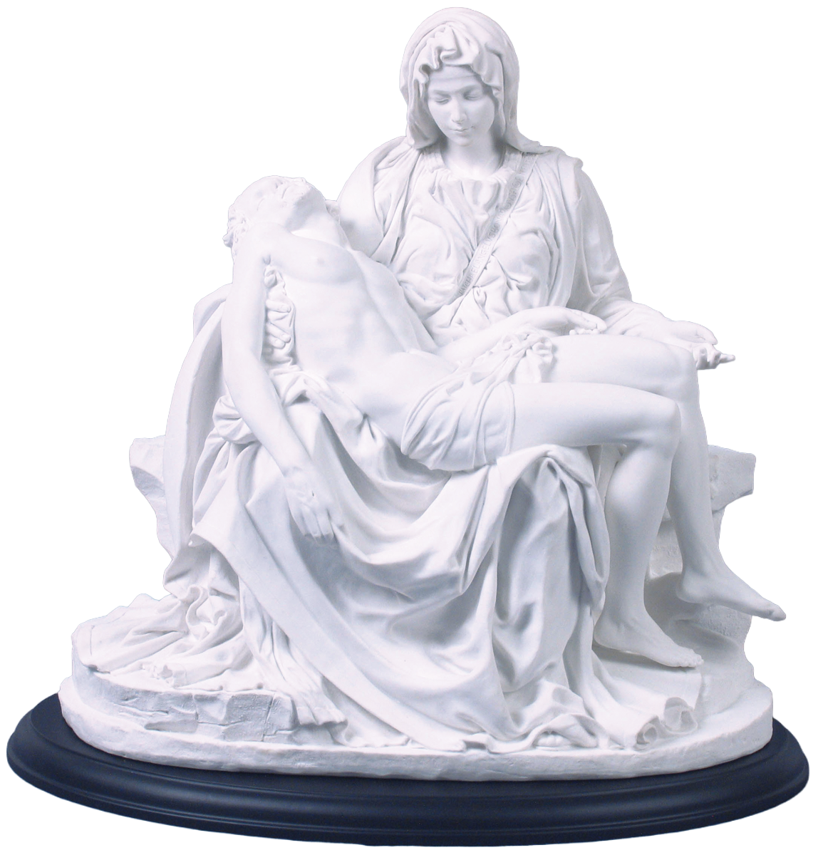 This beautiful Catholic statue is a rendition of the famous piece by Michelangelo, "The Pieta," showing our Blessed Mother receiving the body of her son Jesus into her maternal embrace after his crucifixion.