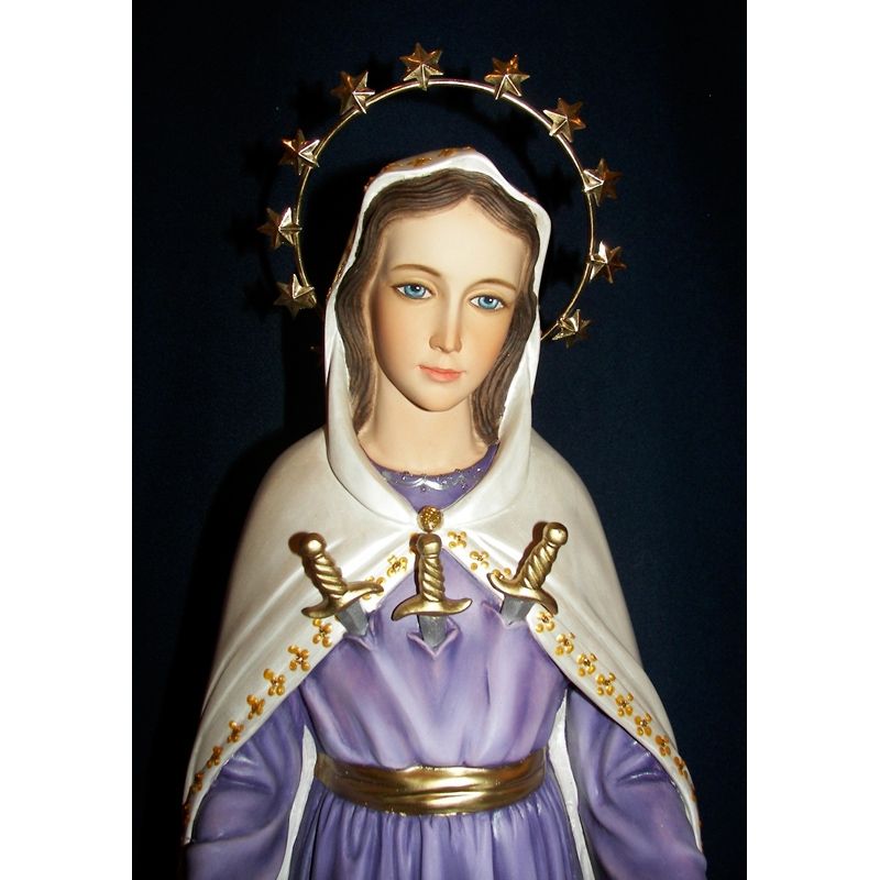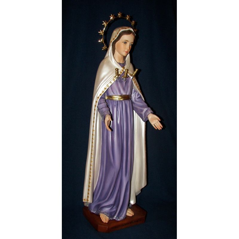 This beautiful Rosa Mystica statue combines two beloved images of the Blessed Virgin Mary, the Mystical Rose and Mother of Sorrows. Instead of three roses, three swords pierce Our Lady's chest beneath a gown of purple, reminding us of the sacred season of Lent when we reflect on the sorrowful Passion of the Lord Jesus. The Queen of Heaven is crowned with a halo of twelve stars, rich with symbolism of the Twelve Apostles and the Church. Beautiful mantle with gold detailing.