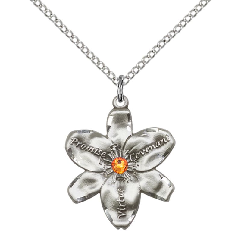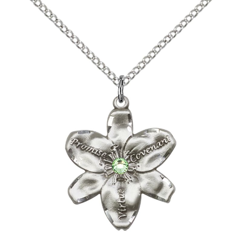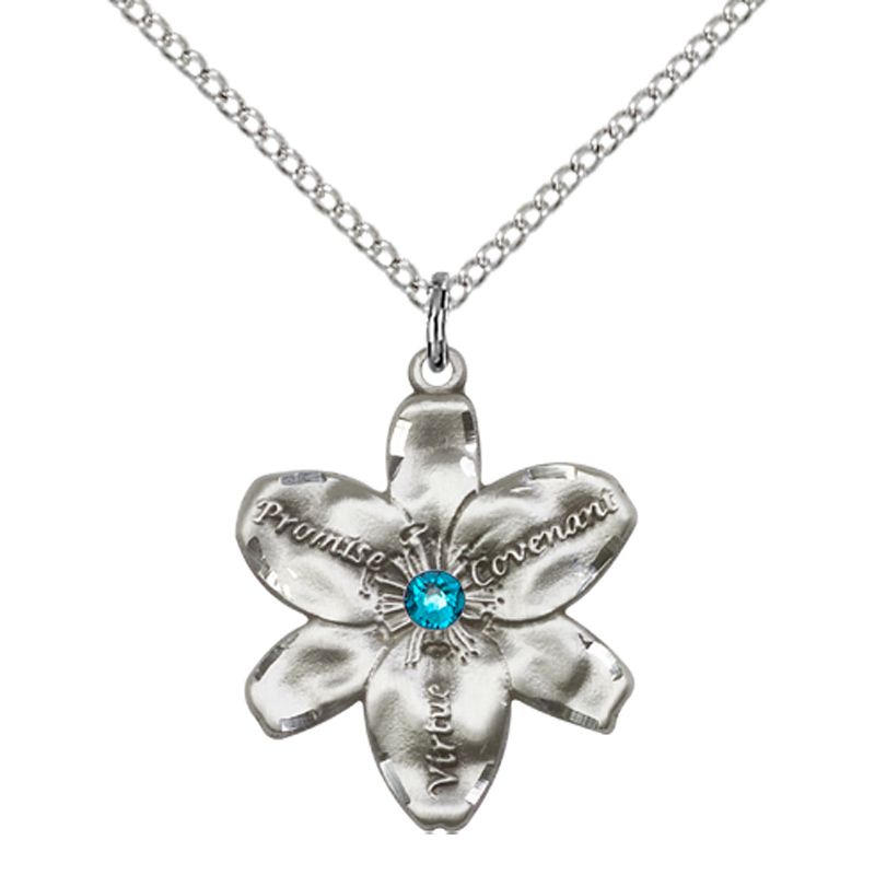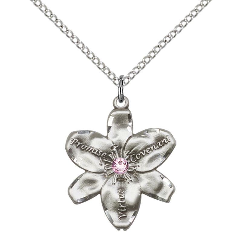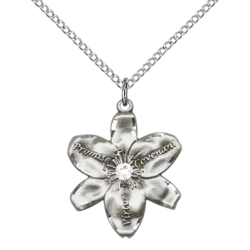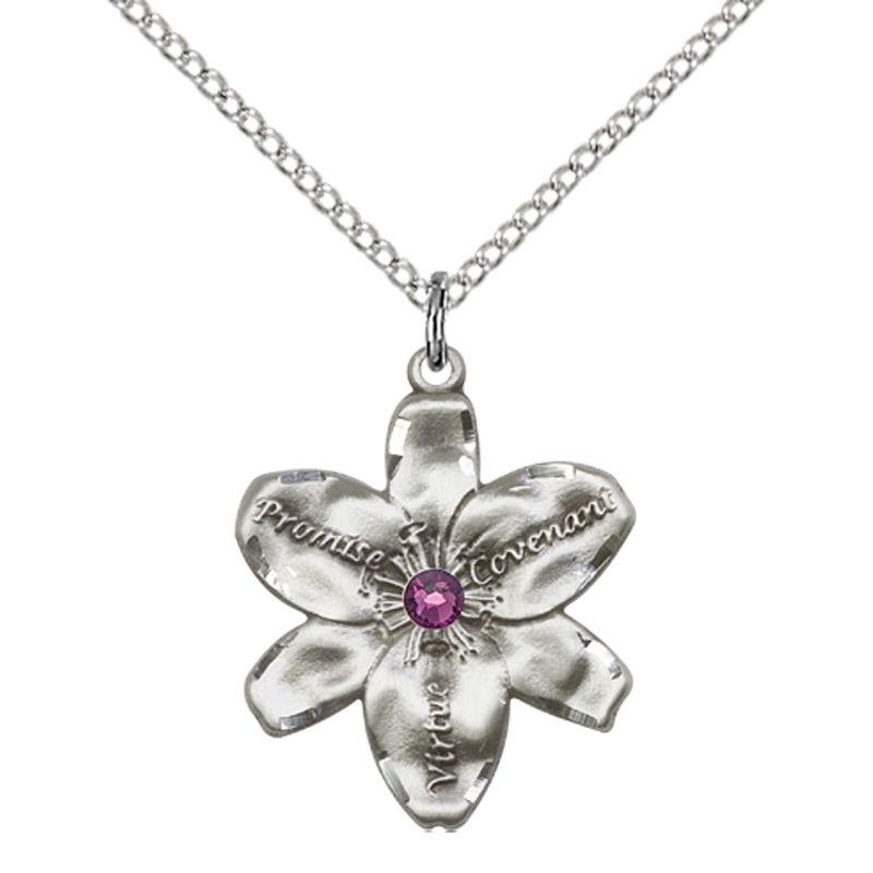 Comes boxed. The petals of this sterling silver flower read: Virtue, Promise, Covenant. Three holy words all reminding the wearer of the precious gift of virtue, the promise to remain chaste until marriage and the covenant with God that every baptized Christian shares in. Available in the below birthstones Months and their stones: