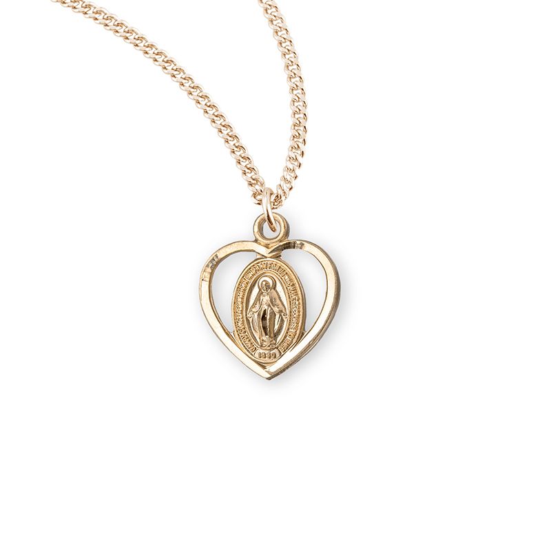 This elegant cut-out style heart really shows off the sweet Blessed Virgin Mary at its center. Complete with all the traditional wording and symbolism, this lovely piece of Catholic jewelry is perfect for daily wear, First Communions, Confirmations and more.