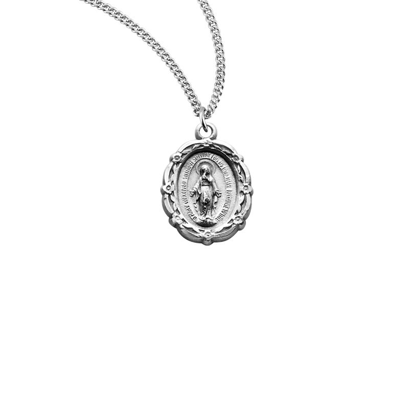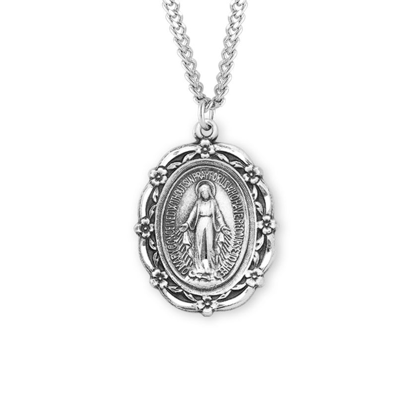 This piece features all the traditional wording and symbolism affiliated with the apparition to Saint Catherine Laboure, as well as the traditional image of the Blessed Virgin Mary surrounded by elegant flowers.