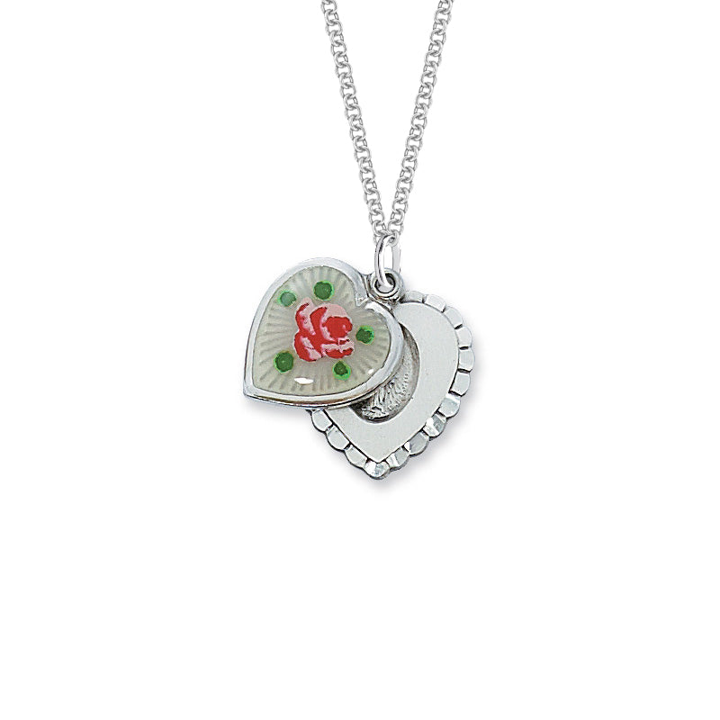 The medal of the Immaculate Conception - popularly known as the Miraculous Medal. Designed by the Blessed Virgin herself! no wonder, then that it wins such extraordinary graces for those who wear it and pray for Mary's intercession and help. Beautiful sterling silver pendant with cloisonne rose top that slides to reveal the Marian image inside.