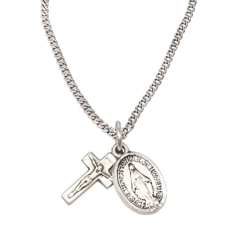 Boxed This elegant piece of Catholic jewelry features the blessed medal of Mary, the Miraculous Medal and the sacred cross of our Lord Jesus Christ! Honor them both with this petite set on a sturdy, 18" stainless steel chain.