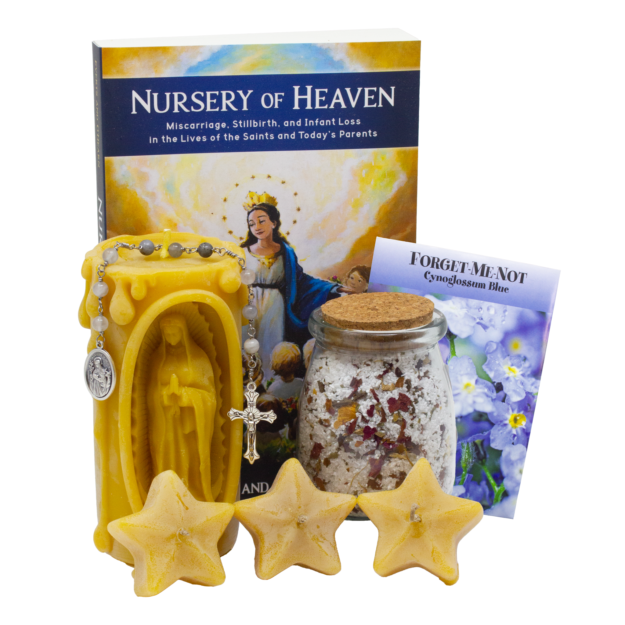 A beautiful, touching memorial gift for those grieving the loss of a child. The large style comes with the, "Nursery of Heaven" book, chaplet beads with prayer folder to St. Catherine of Sweden Patroness of women who have had a miscarriage, Lady of Guadalupe candle, bath salts, star votive candles, and "Forget Me Not" seed packet. Candles are 100% beeswax. (Seed packet and prayer folder not shown in images)