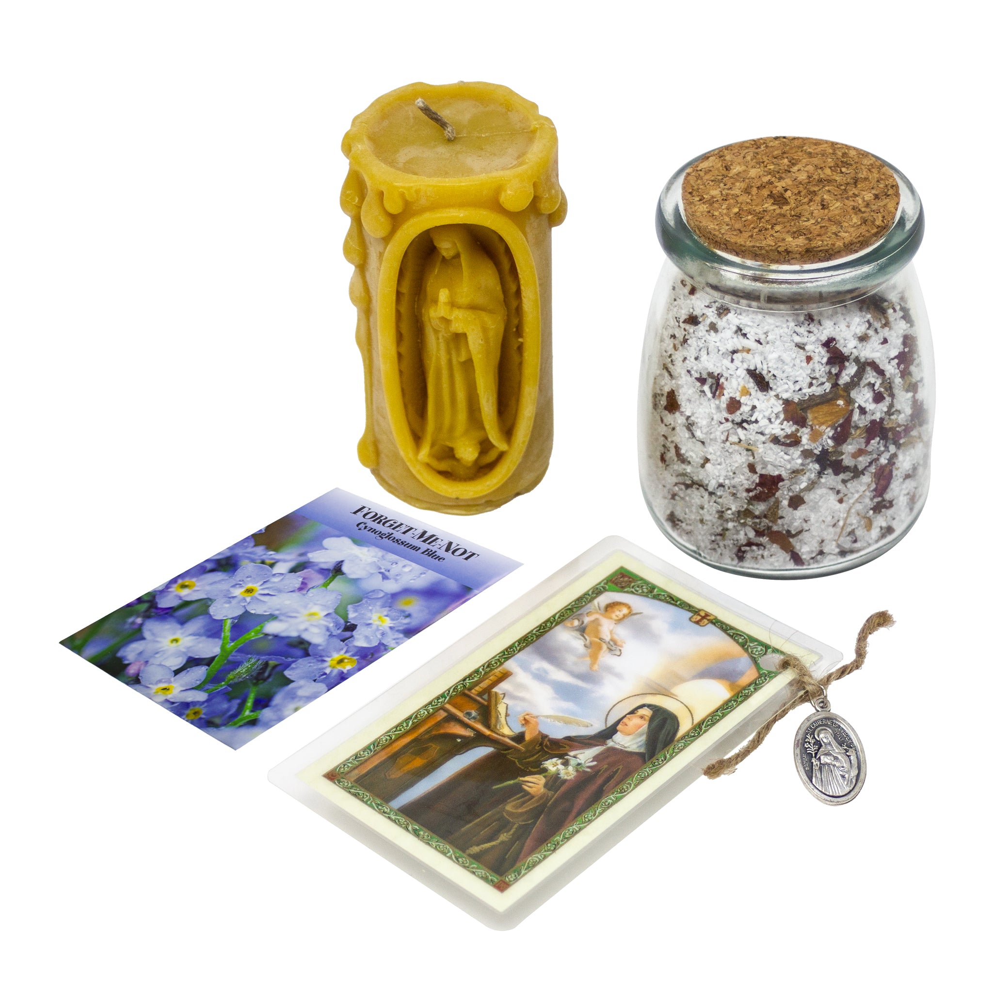 **Small comes with only the candle, a holy card to St. Catherine of Sweden with medal, bath salts, and seed packet.