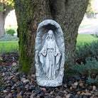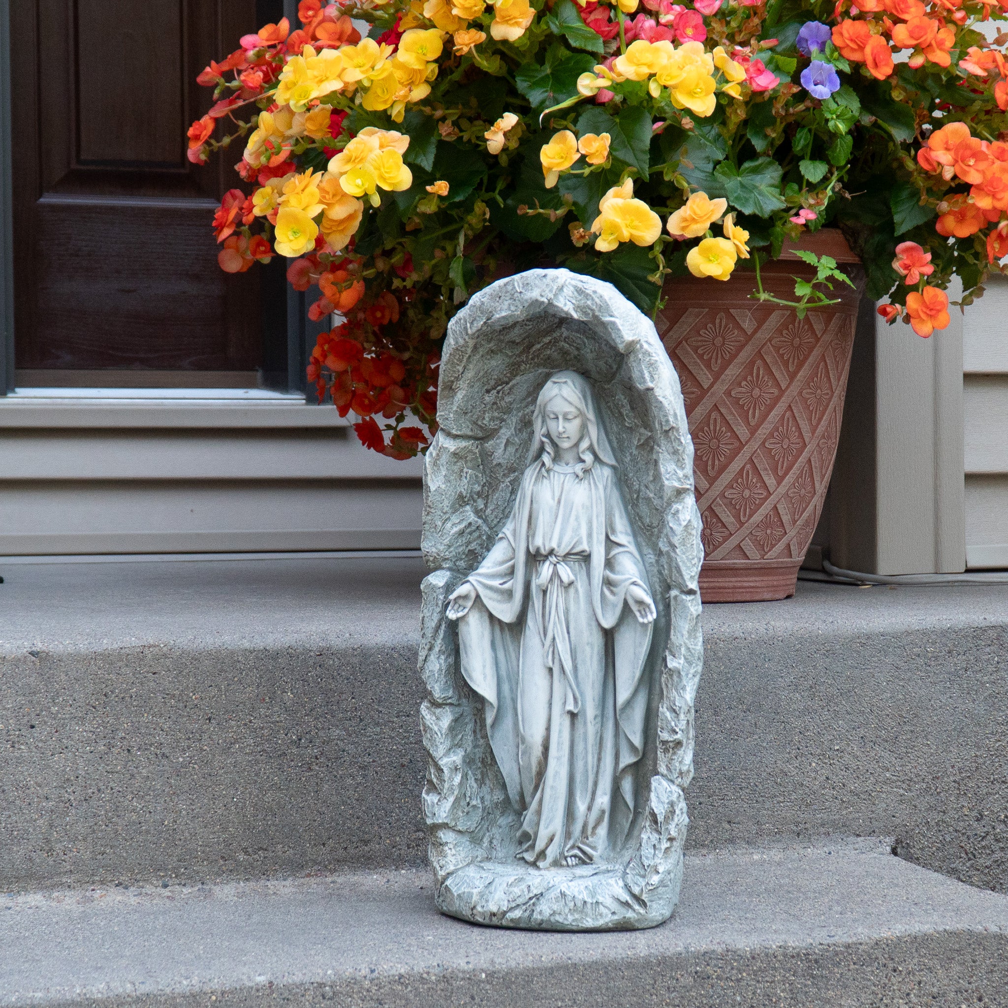 This lovely piece shows a traditional image of our Blessed Mother with her arms open and radiating love and mercy. Faux stone resin figure takes in the day's sunlight, and radiates softly at night.