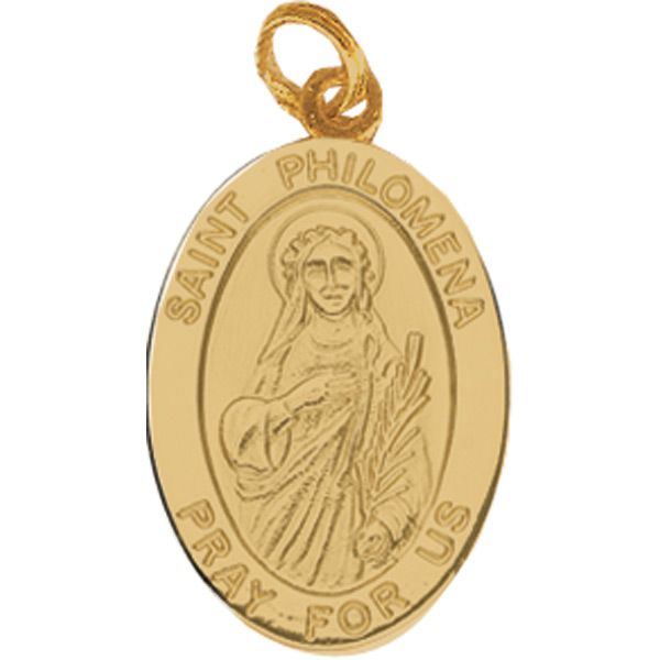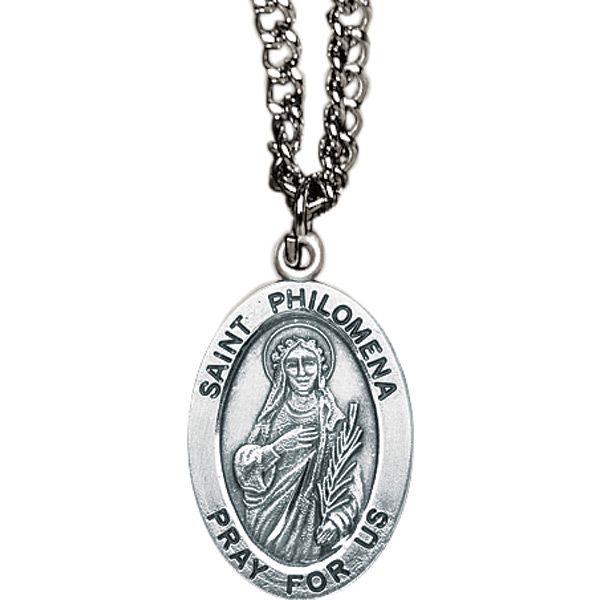 Nothing historical is known about this holy woman save that her tomb indicated that she was a virgin and martyr. She is the only person to have been canonized based solely on reports of intercessory prayers and miracles. She was a great patroness to such lights as St. John Vianney and St. Pauline Jaricot. Reads, Saint Philomena Pray For Us around the outside edge.