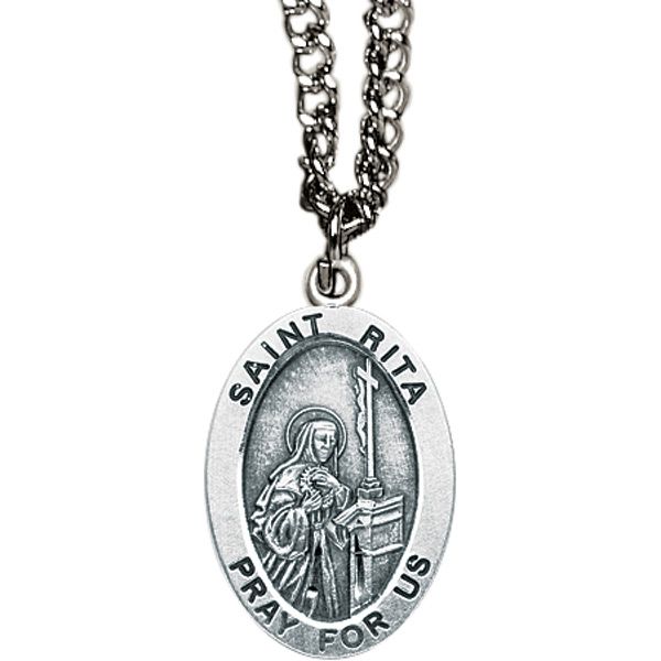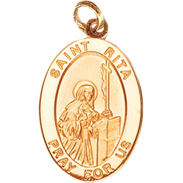 This holy woman is often called the patroness of the impossible because of the great many obstacles she faced and overcame during her earthly life. A difficult marriage, wayward children, denial into religious life and other struggles, St. Rita persevered through prayer, fasting and union with God. Reads, Saint Rita Pray For Us around the outside edge.