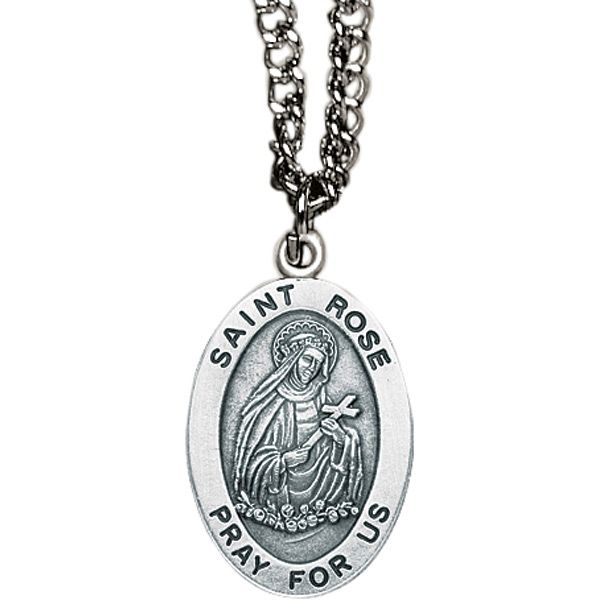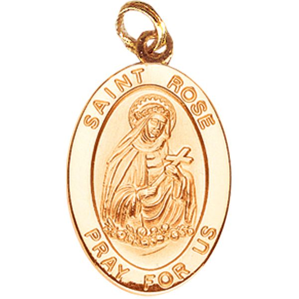 This holy woman was given the name Isabel when she was born, but was so beautiful that she was called Rose. So beautiful that many courted her, but she desired no human attention and inflicted pain and suffering on her body to deflect the temptation. Her heart had been given to Jesus and Him alone. Reads, Saint Rose Pray For Us around the outside edge.