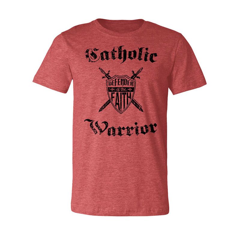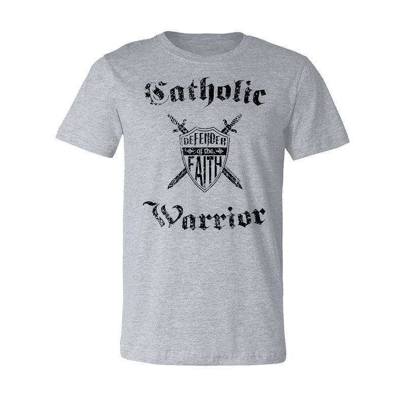 This powerful, bold shirt proclaims your stance as a Catholic warrior, one ready to defend the faith! With this shield and crossed swords design, and bold Gothic letting, people will know where you stand on issues. Makes a great gift for apologists, religious education teachers, and anyone on fire with the Spirit of Truth!