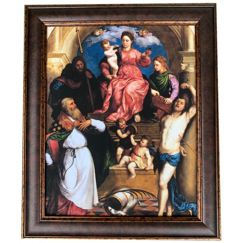 This magnificent image of the Blessed Virgin by the artist Cantarini features the Queen of Heaven and Earth seated with various Saints around her. Beautiful archival quality Giclee canvas, under glass.