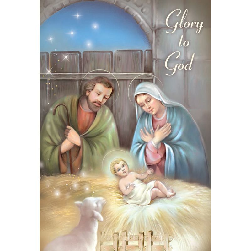 Classic and traditional, this Christmas card offers a reverent look into the holy birth of the Lord Jesus on that first Christmas. Joseph and Mary look on with the humble sheep as the Lamb of God seems to welcome you into His love.