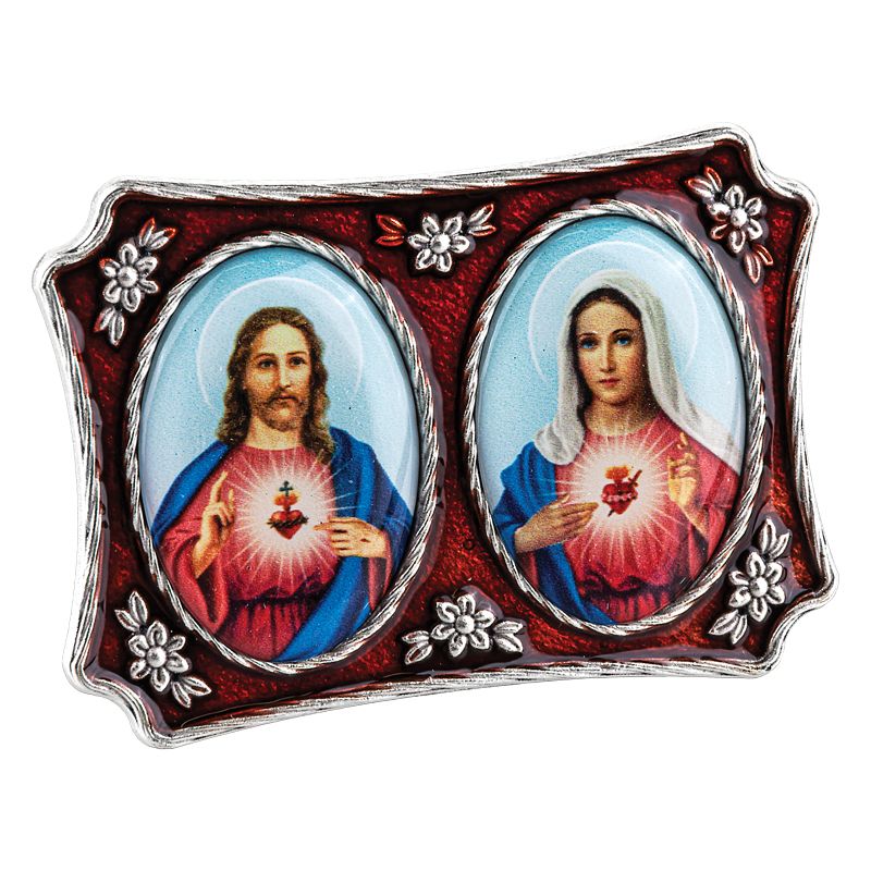 A gorgeous image of the traditional Twin Hearts of Jesus and Mary, surrounded in the color red to accent their powerful love for us all.