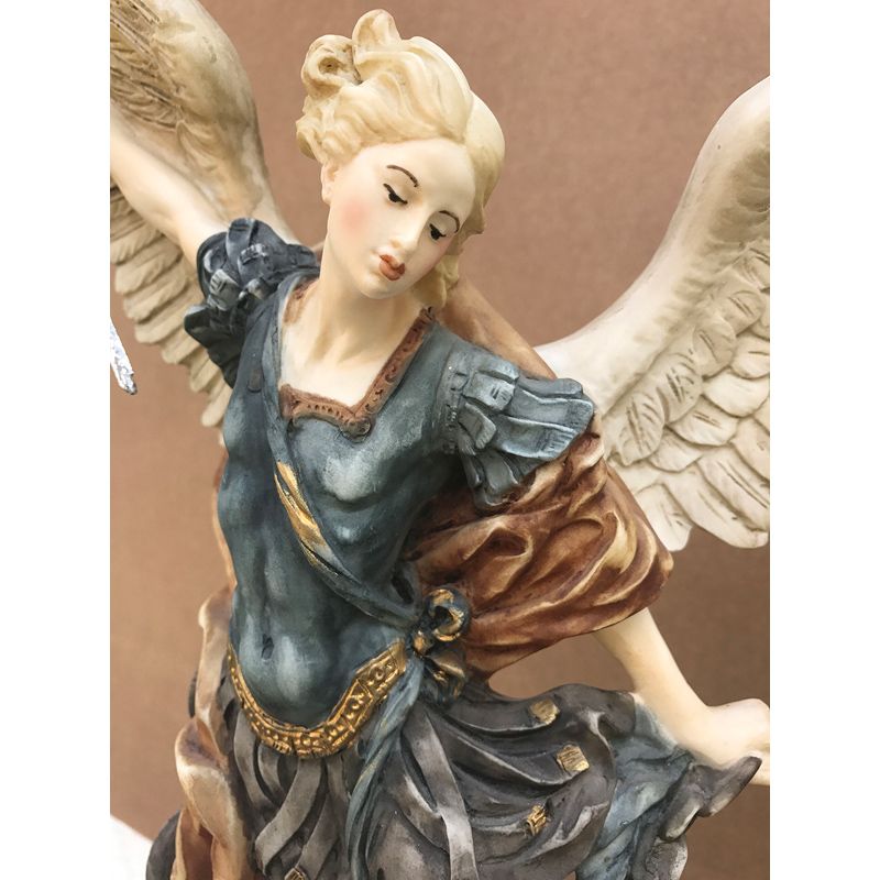 This powerful Catholic statue features the Archangel Michael sweeping the Devil out of Heaven with majestic wings spread wide and sword at the ready. Part of the Santini collection, and made of richly painted alabaster on a wooden base.