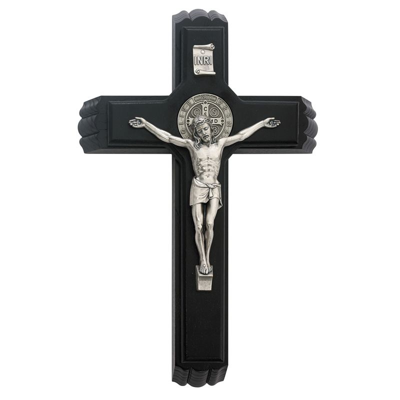 This gorgeous set features a stunning wood base and crucifix, with a silver tone corpus of our Lord Jesus, set with the powerful medal of St. Benedict behind His Sacred Head. Inside is the storage for the candles and bottle for holy water, items needed for a sick call visit from the clergy.