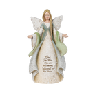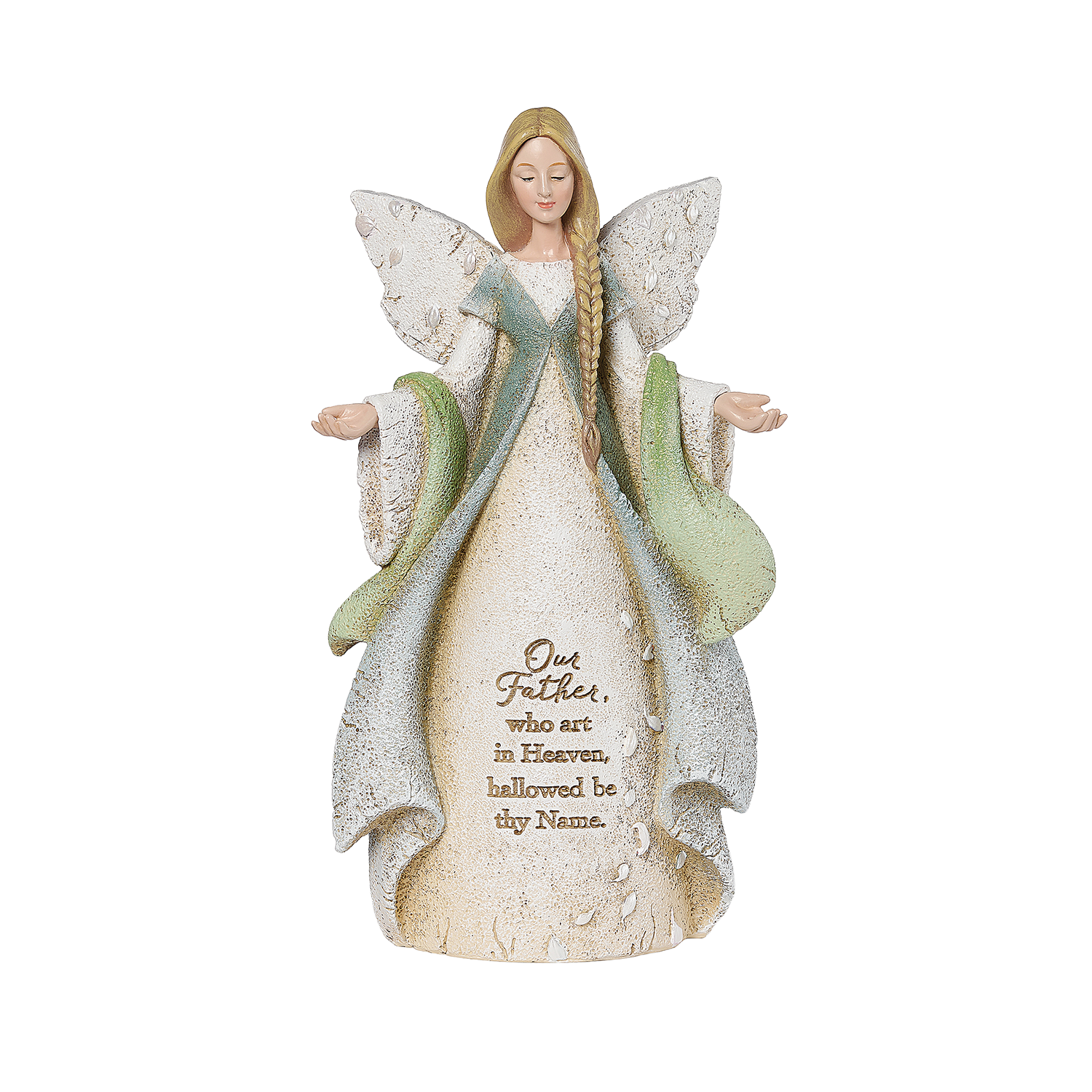 Sometimes just what we need is a reminder that our normally invisible angel companions are with us. This figure features an angel in flowing garments with open arms. Reads: Our Father, who art in Heaven, hallowed be thy Name.