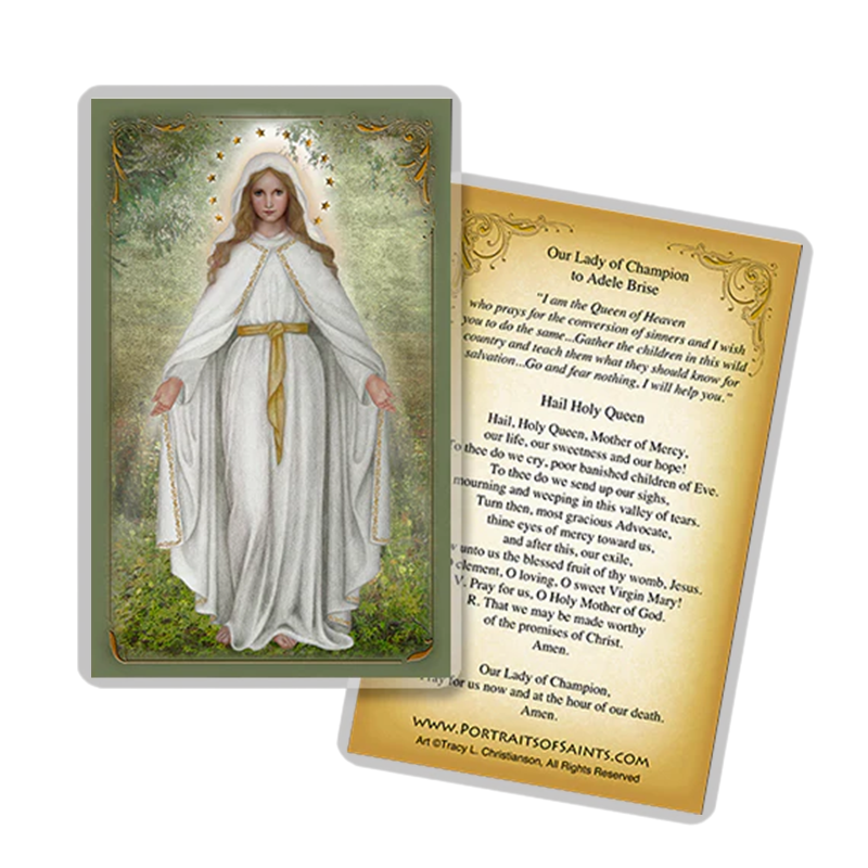 Explore our online selection of Our Lady of Champion products, inspired by the only approved Marian apparition site in the United States. Previously known as Our Lady of Good Help, this apparition and shrine is just one state over from us in Wisconsin! Our collection features the exclusive personal-sized statue of Our Lady of Champion - available only at our store. You'll also find Champion-themed apparel, a keychain, fun devotional socks, a beautiful plaque, and inspiring books that share the story of Our Lady’s message in Wisconsin. Perfect for pilgrims, collectors, and those new to the devotion, these Our Lady of Champion gifts honor “America’s Mary” with reverence and joy. Our Lady of Champion, pray for us!