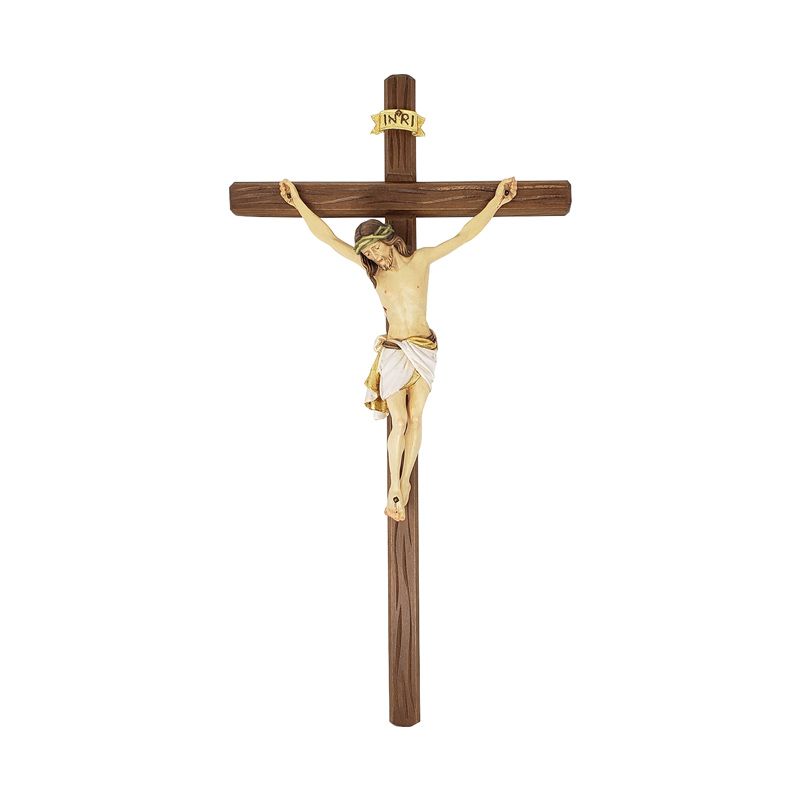 This gorgeous Catholic crucifix features the Lord Jesus on the cross, suffering His Passion and Death for the redemption of humanity. Done in beautiful sculpted wood and lightly painted, you'll treasure this piece for years to come. And it makes a memorable gift for Confirmations too!