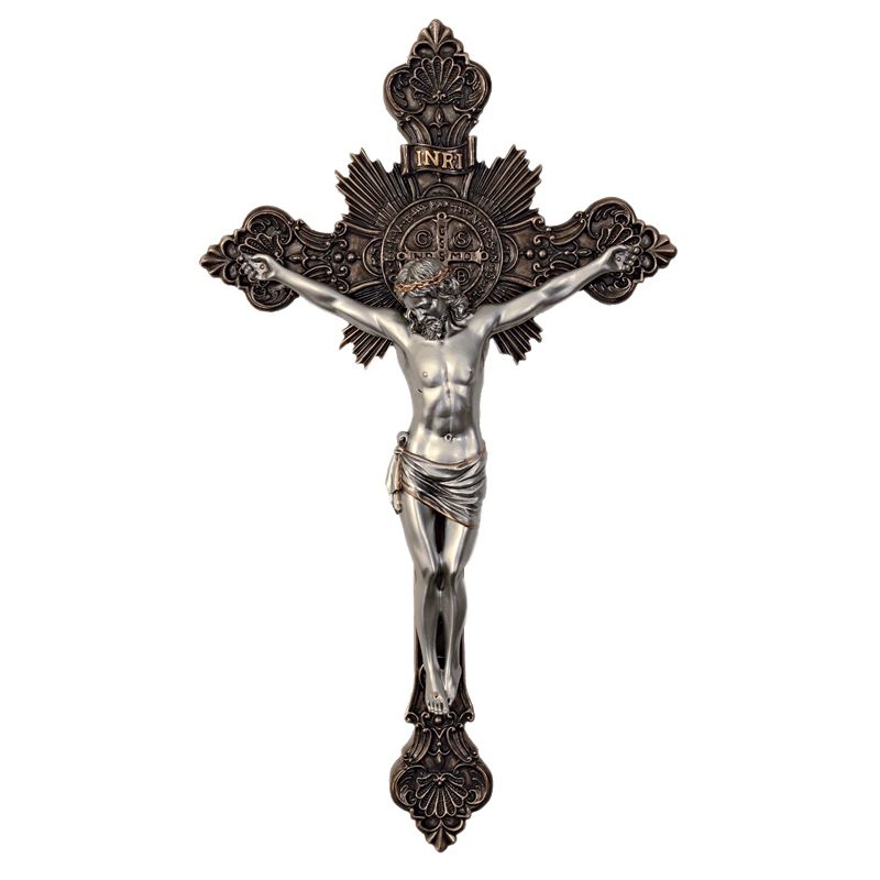 The powerful medal of Saint Benedict, paired with the sacred Cross of our Lord Jesus makes a great focus for Lenten prayers, or reflection on the Passion anytime. Great for any home room or chapels. Bronze-toned resin cross with silver colored corpus.