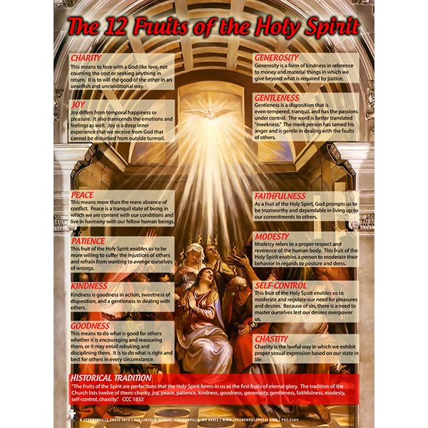 This sturdy, laminated poster is great for Catholic schools, classrooms, homeschools or even just having in the home as a reminder of the blessed Twelve Fruits of the Holy Spirit.