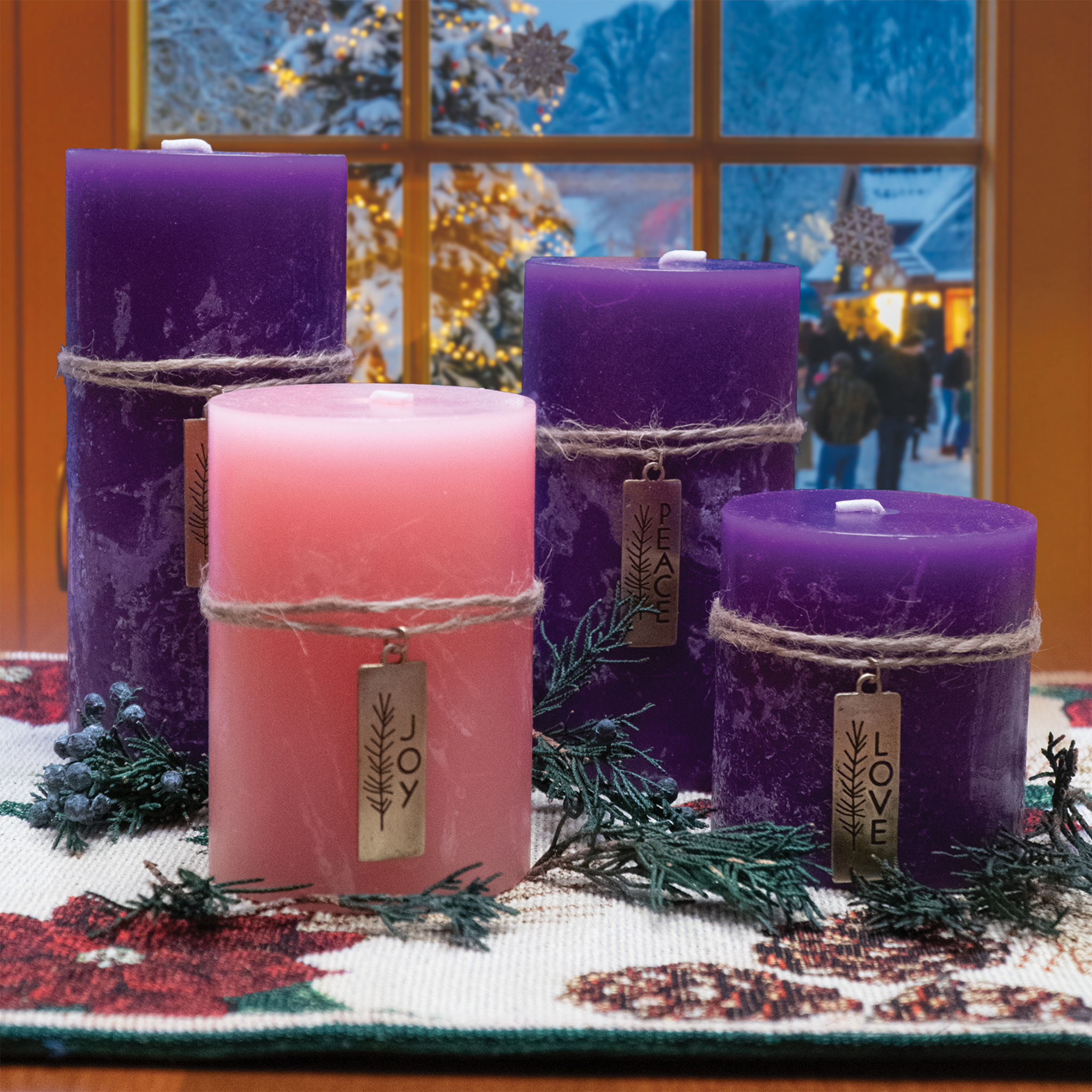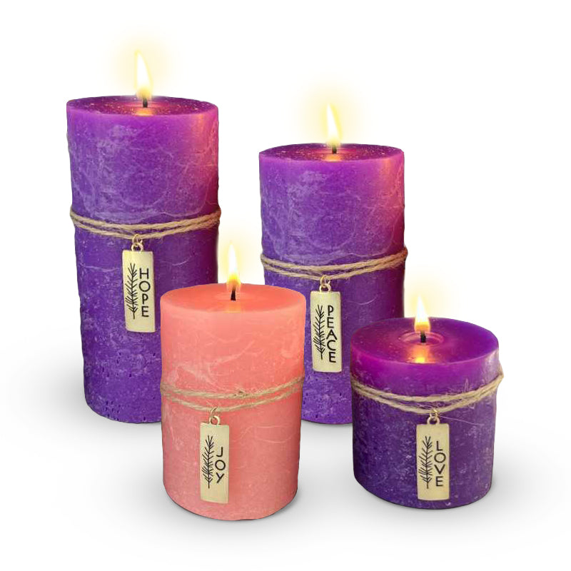 Textured wax with metal HOPE, PEACE, LOVE, JOY theme charms. This is a unique set of candles without a traditional Advent candle base to aid you in honoring the sacred season of preparation for the Lord Jesus' birth.