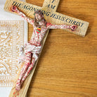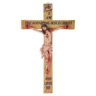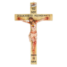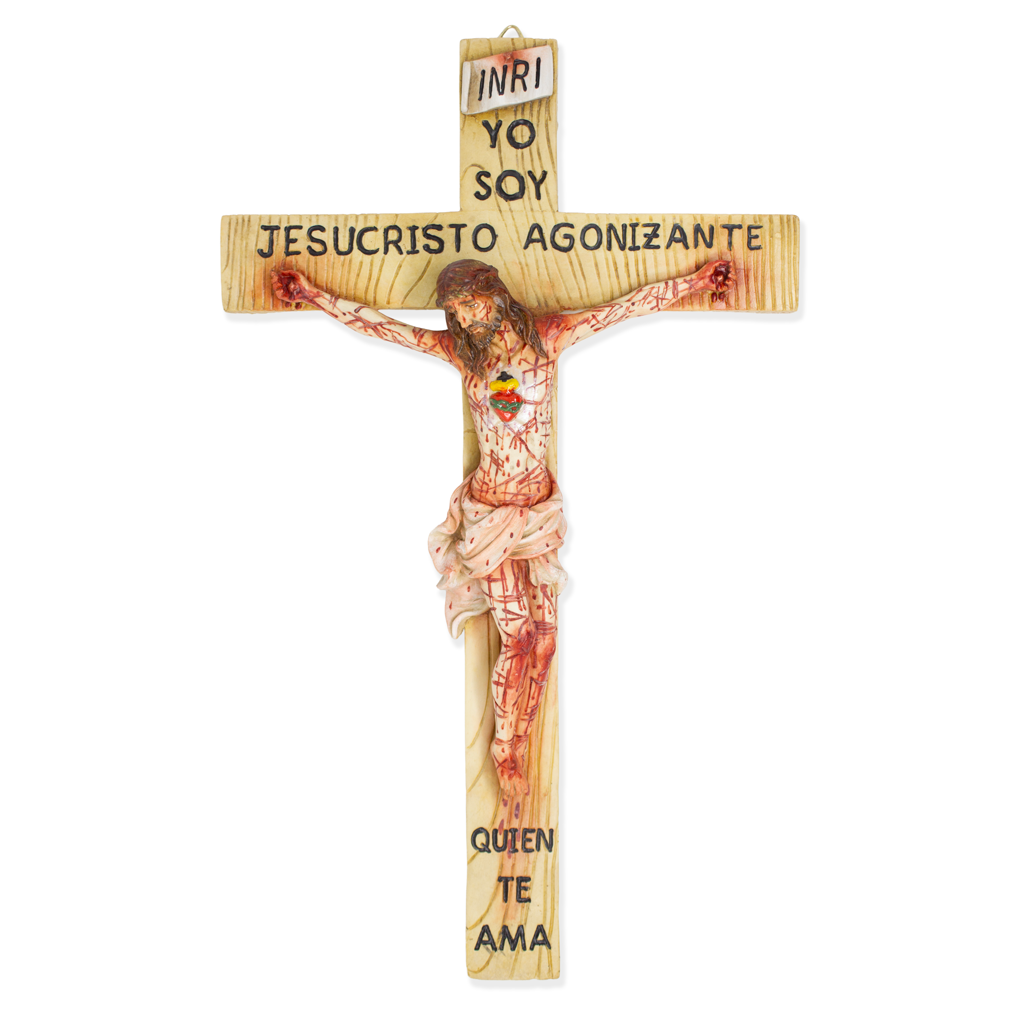 This powerful cross features a more graphic image of the crucified savior than many crucifixes, and this is due to the unique promises of grace, protection and salvation granted to those who will meditate on the Passion of the Lord Jesus Christ. The wording on this cross reads, "I am the agonizing Jesus Christ who loves you." He asks you to take up the cross daily, recognizing that the wounds shown on it were borne out of love for you and for the world.