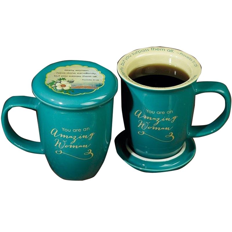Remind the beautiful and blessed ladies of your life that they are not only amazing in your eyes, but beloved in the eyes of the Lord God in Heaven as well. Lovely, teal colored mug with pale interior and verse from Proverbs around the lip and lid. Perfect for steeping tea, and the lid doubles as a coaster.