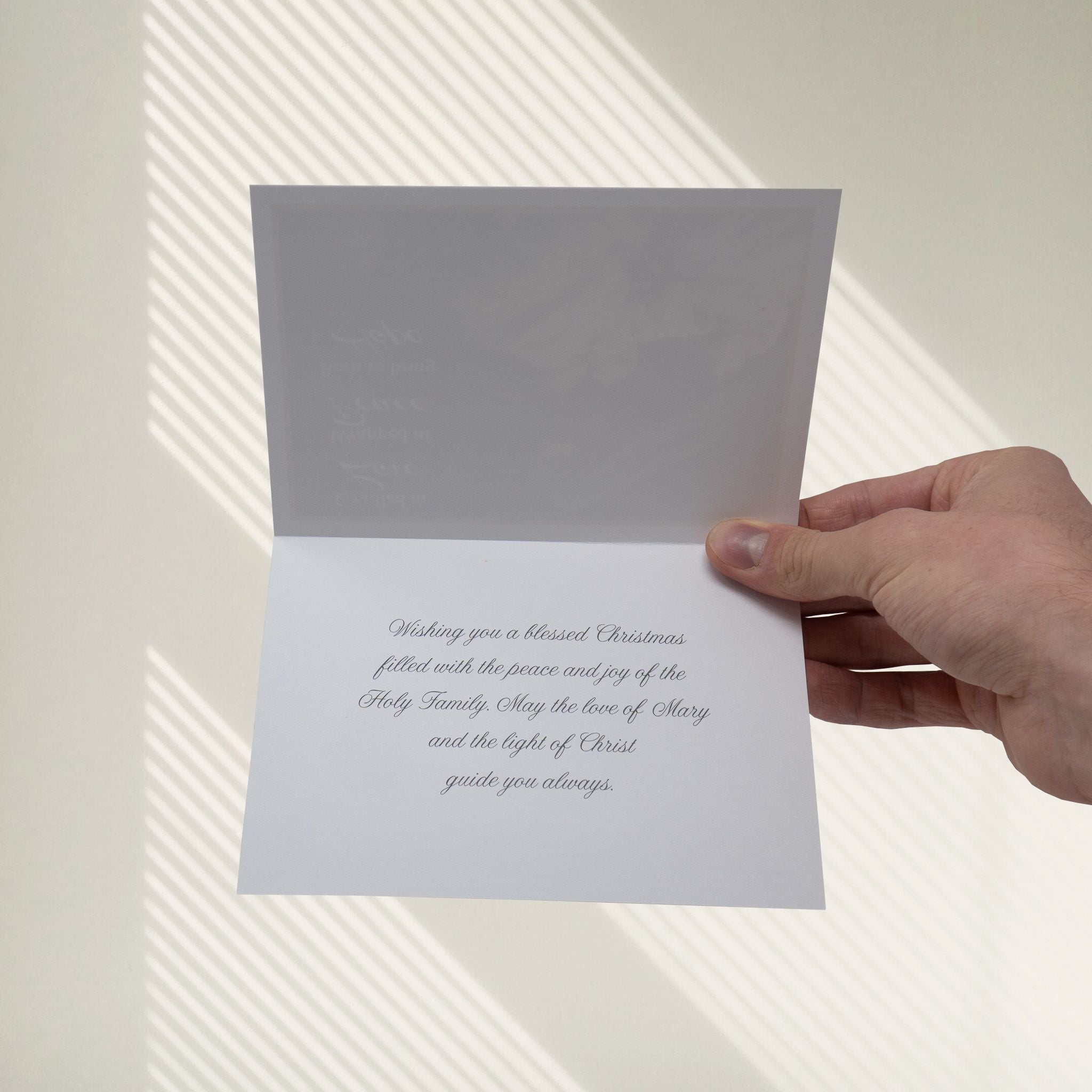 25 Cards. Inside: "Wishing you a blessed Christmas and a New Year filled with peace and love." Measures approx. 4 x 6" with envelopes.