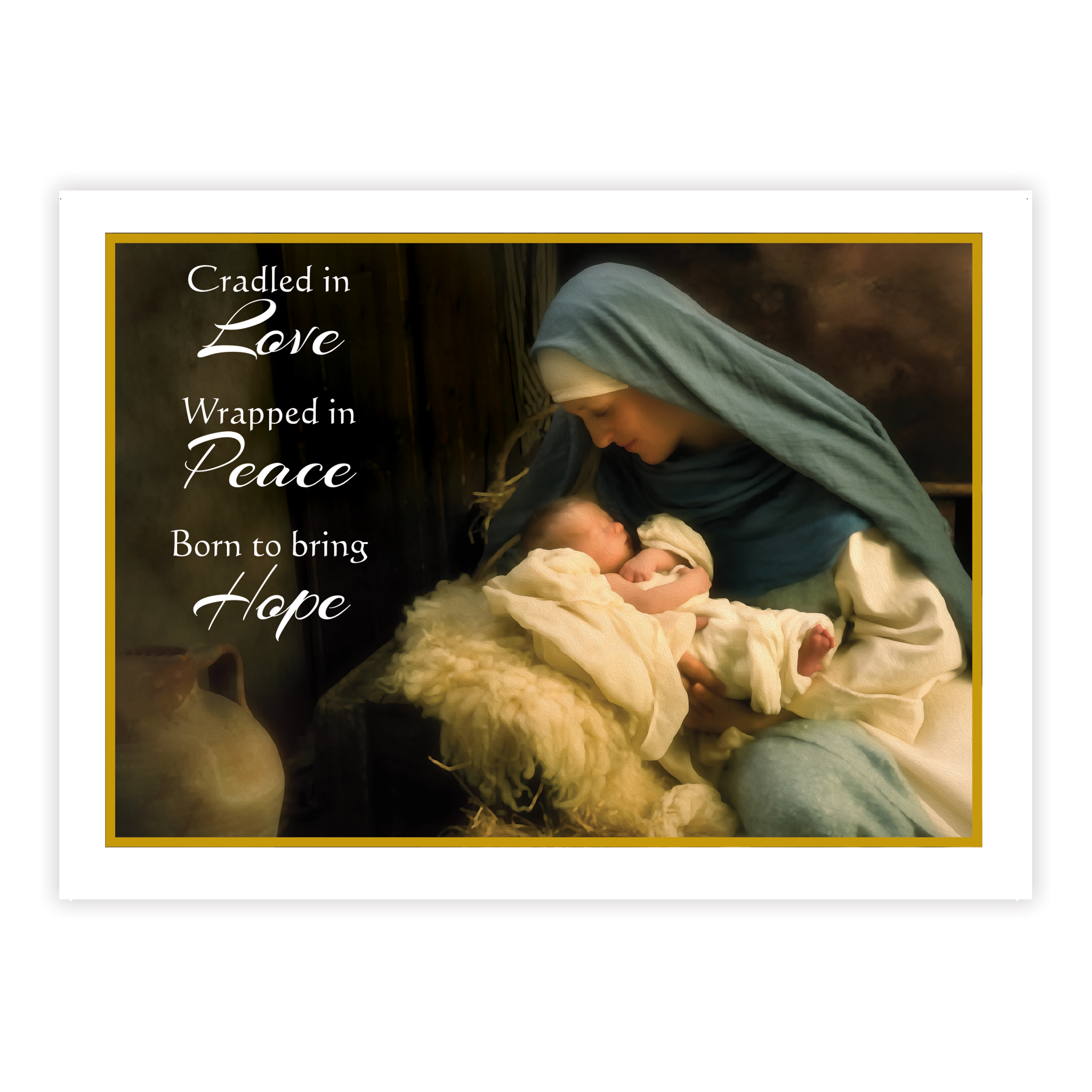 Softly out of focus image, almost like a vintage photo, this gorgeous card shows the Blessed Virgin Mother sweetly adoring her infant son and our Savior.