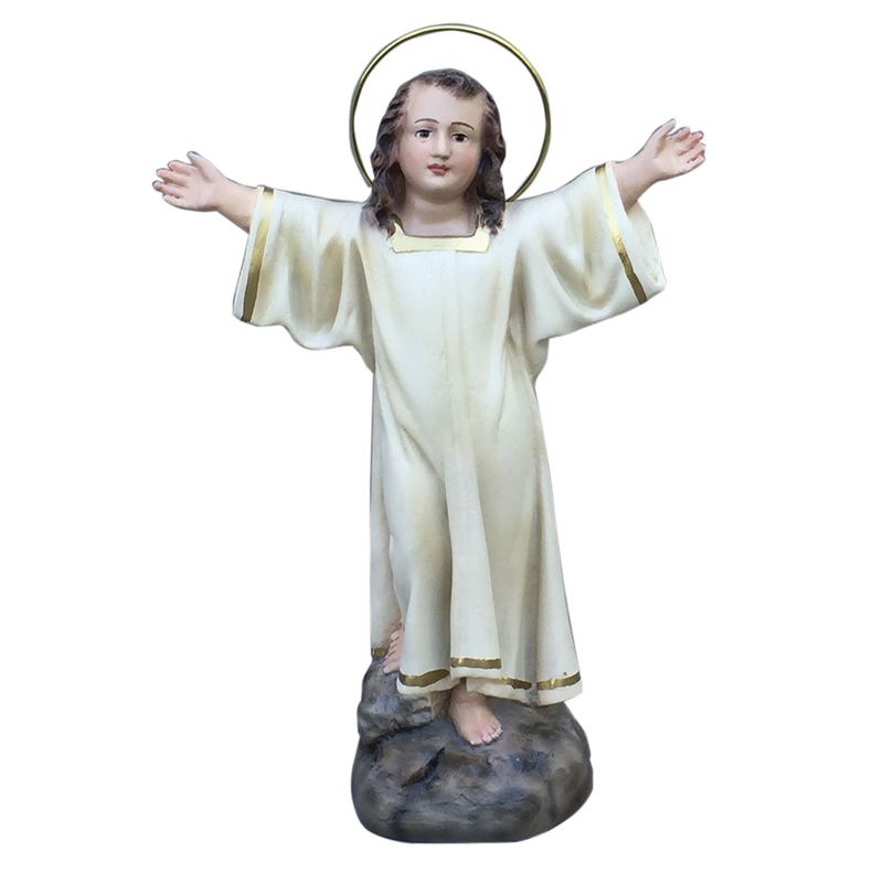 It can be hard to believe that Jesus became a human being in order to redeem us from sin. And yet so the Church tell us, and we believe. This lovely, classic plaster statue shows the humble, little Lord with arms outstretched in love, welcoming sinner and saint to His mercy.