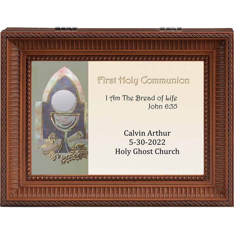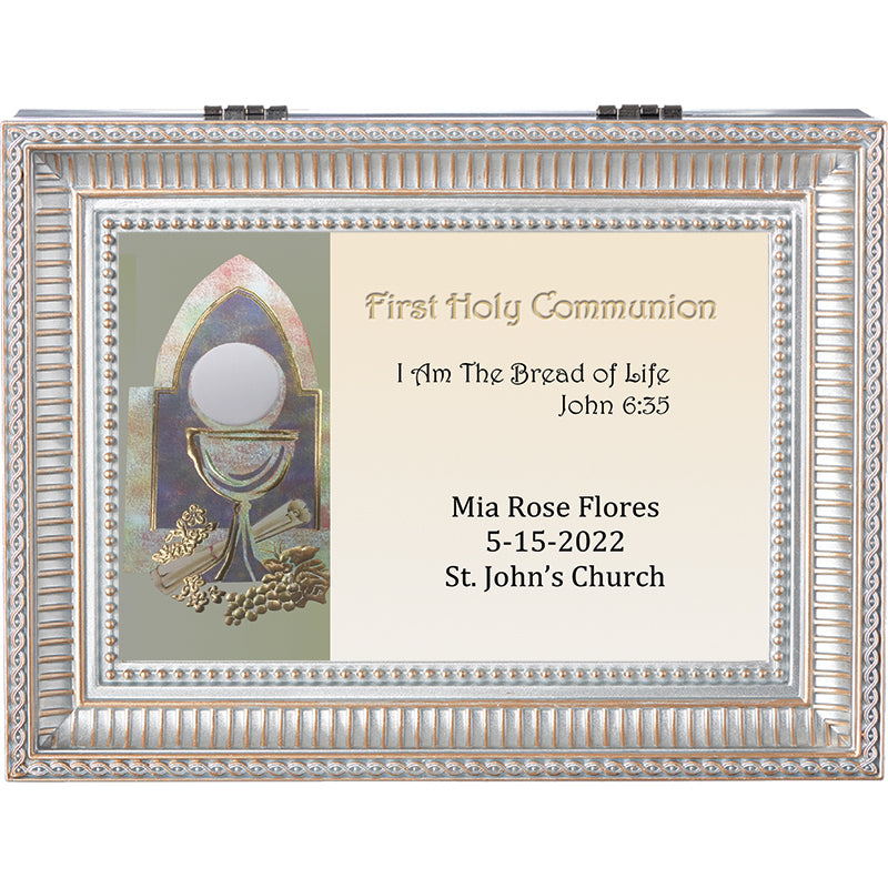 One of top selling Catholic gifts, these music boxes are available in two color choices. The classic brown plays What A Friend I Have in Jesus, while the silver color plays Amazing Grace. Each has the chalice and host symbol on the side, with the text reading: First Holy Communion, I Am The Bread of Life, John 6:35. Along with these features, you add 3 lines of personalization, the name, date and church for your communicant. Absolutely beautiful and special.