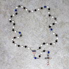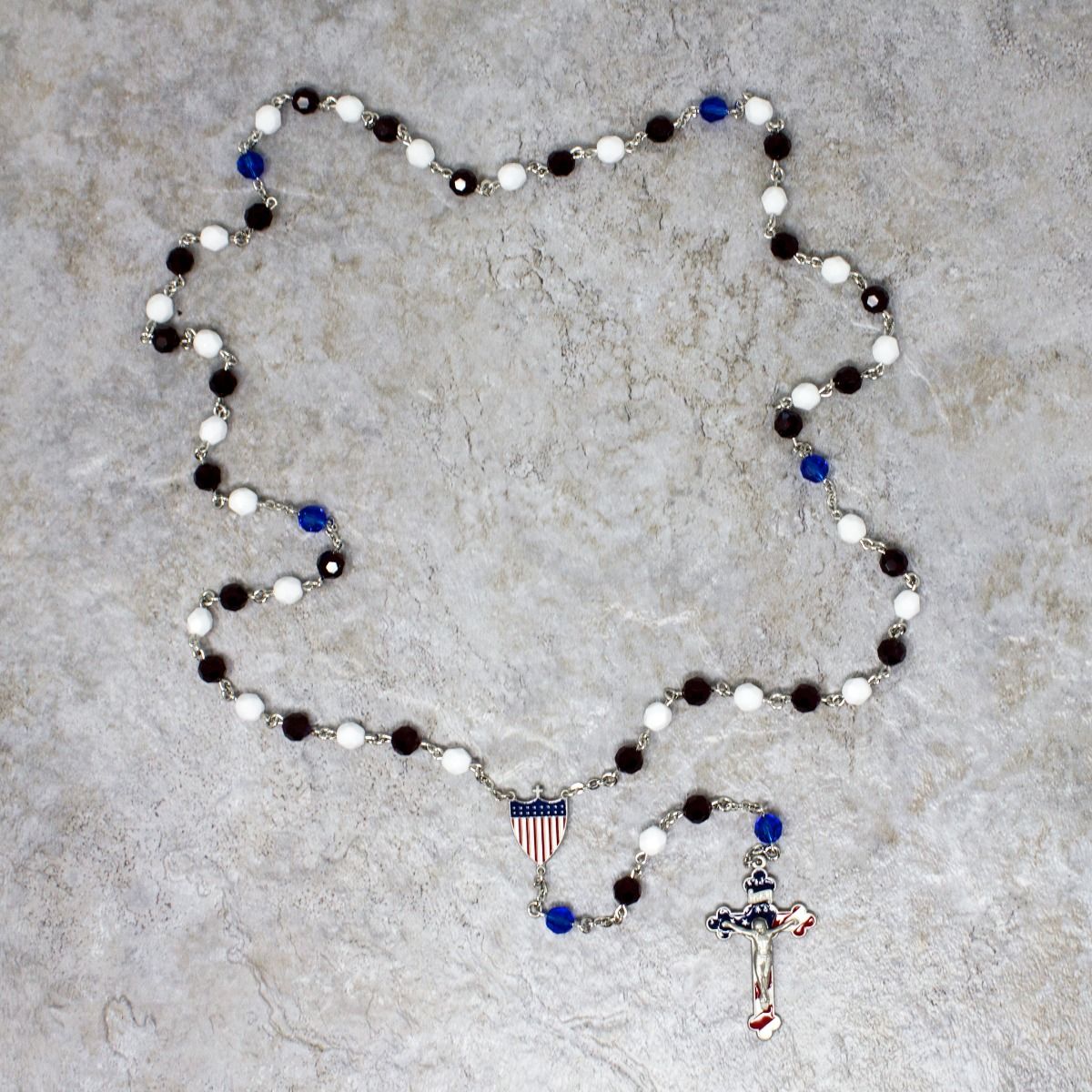 This gorgeous rosary is handmade in the USA by expert silversmiths. With enameled pewter components cast by veterans and 6mm czech glass beads, this rosary honors America in a unique way. The rosary features the stars and bars of Old Glory on the crucifix and on the shield-shaped centerpiece. The centerpiece dye dates back to World War 2! Measures about 22.5" long and comes in a blue velvet gift box. Reclaim America for Jesus and Mary!