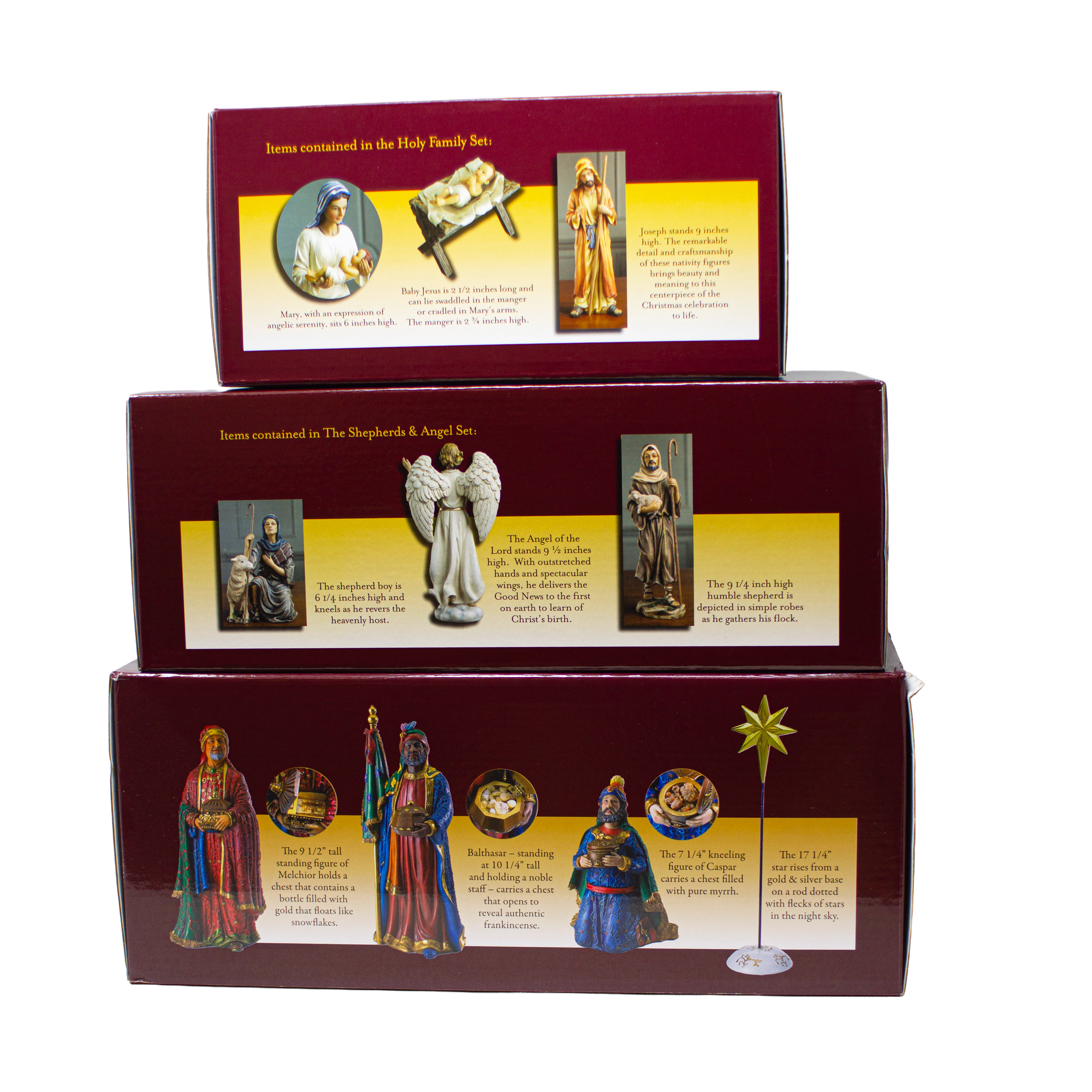 This gorgeous 11 piece Nativity features realistic figures, painted with amazing attention to detail. A set you'll be proud to display for years and perhaps pass on as a treasured heirloom!