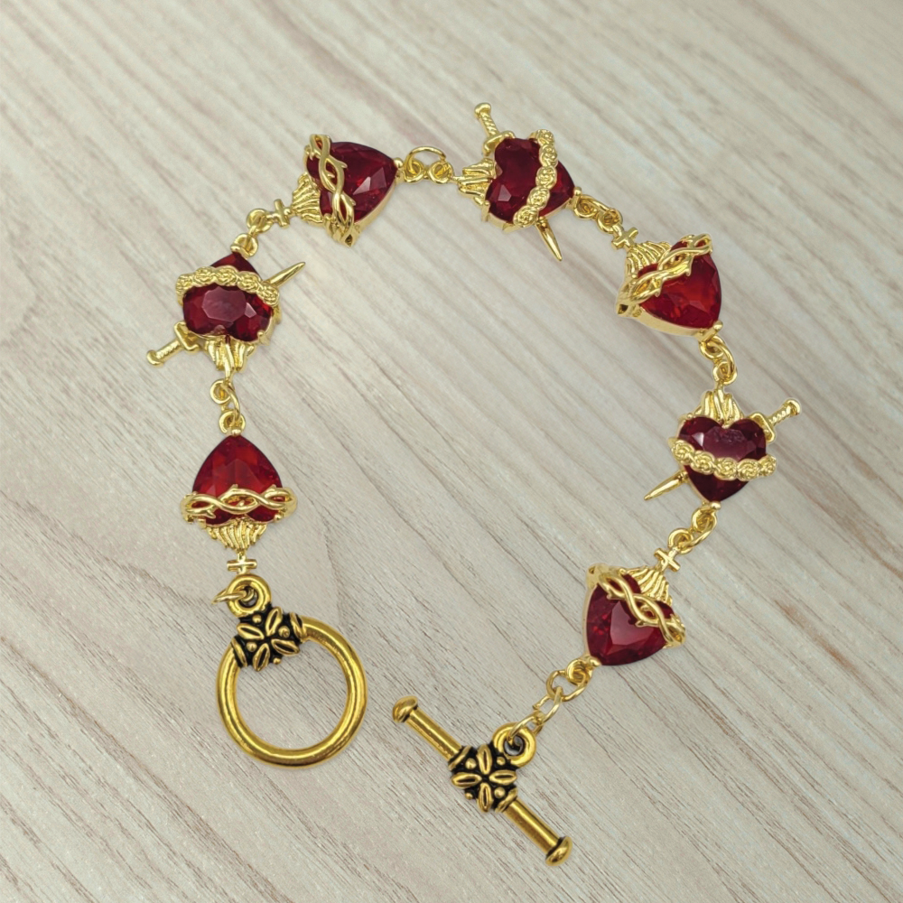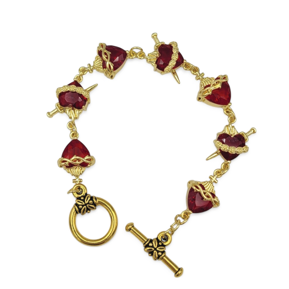 This stunning piece is made of Cubic Zirconia red beads wrapped in gold tone hearts of our Lord Jesus and Lady Mary.