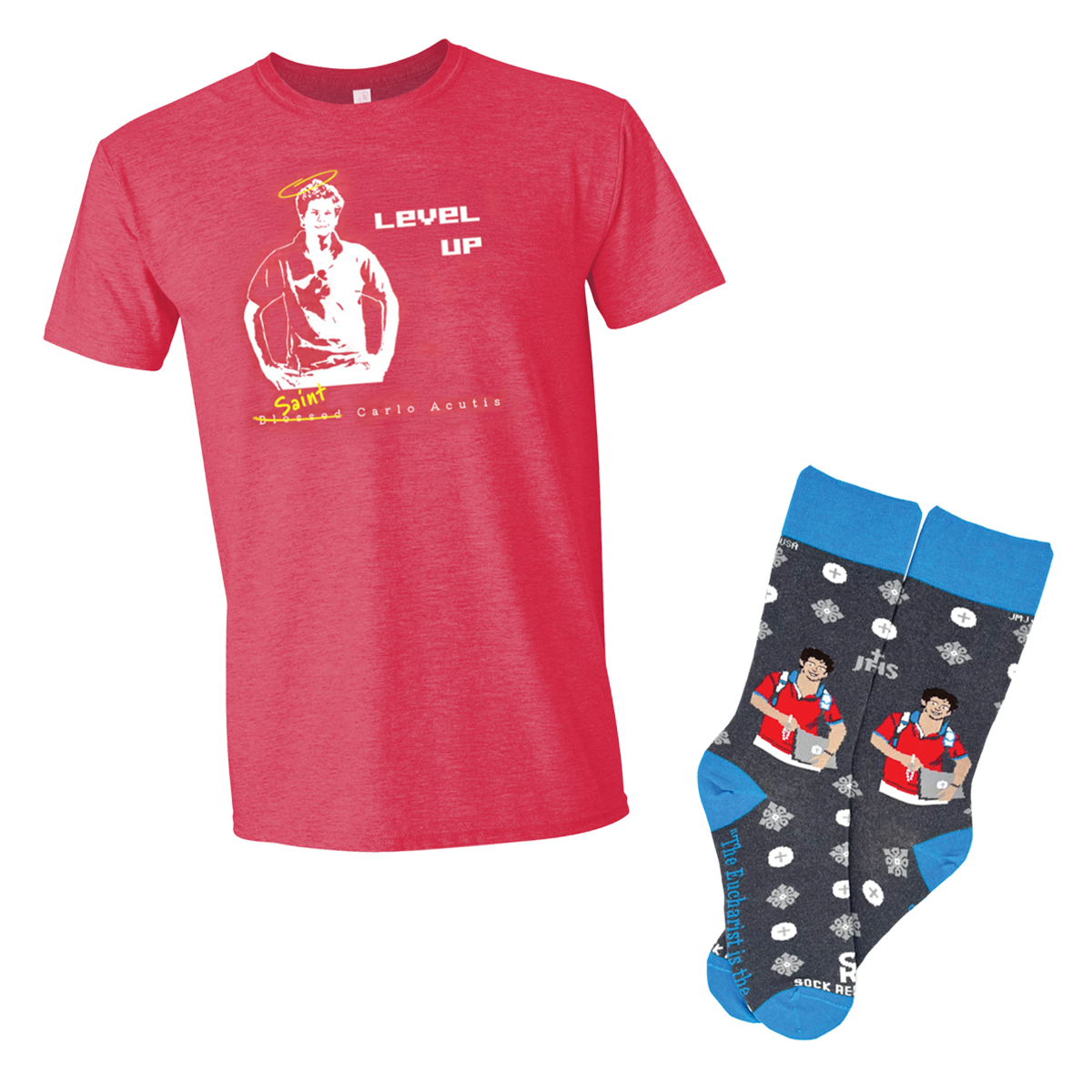 Coordinate your Acutis outfit easily with this "combo." Choose your socks and T-shirt inspired by the first "millennial in paradise."