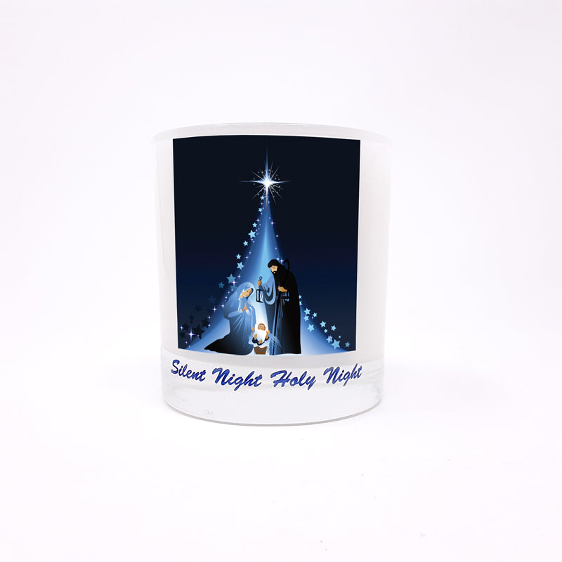 Lovely, pine scented soy wax candle with approx. 90 hour burn time (if left to go continuously) Remember that candles should always be attended for safety. Measures about 3.5" high. Reads: Silent Night, Holy Night.